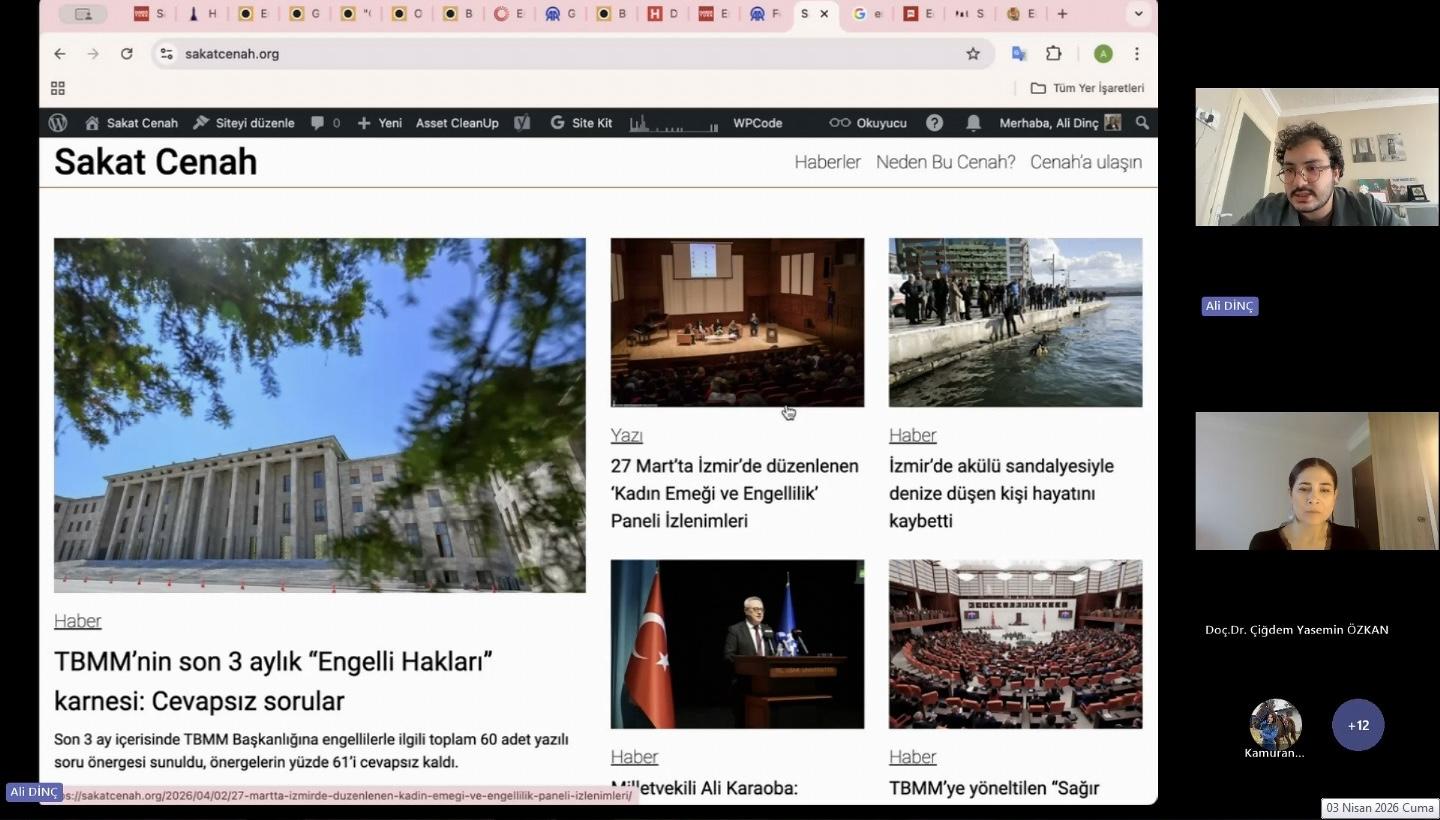 Doç. Dr. Çiğdem Yasemin Özkan Berksun tarafından yürütülen ders kapsamında gerçekleştirilen Microsoft Teams toplantısına, muhabir ve Sakatcenah.org’un kurucusu Ali Dinç konuk oldu. Etkinlik, dersi alan öğrencilerin yanı sıra Çukurova Üniversitesinden katılım sağlamak isteyen herkese açık olarak düzenlendi.